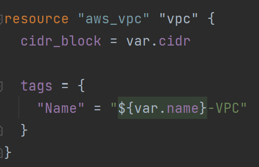 “tags” – Every resource is able to receive “tags”, which are AWS-side identifiers used to group resources. In this case, we nest the “Name” tag within the tags section – which will show up at the literal resource name on the AWS-side. As you can see, the name will be a combination of the variable “name” with “-VPC” appended to the end of the variable.