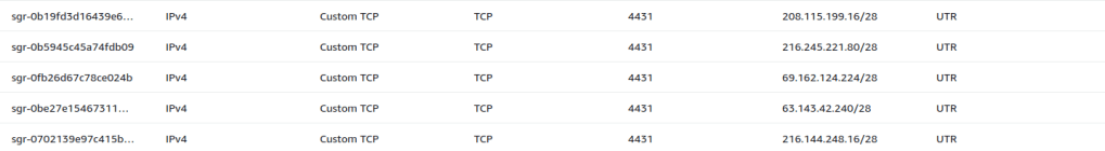 So now I have an SSL health check endpoint listening on port 4431. To secure the endpoint for traffic only from UpTimeRobot, I grabbed the list of UpTimeRobot public IPs and put those into security group rules in AWS: